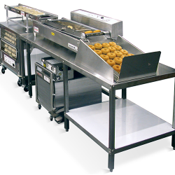 Simple, efficient method of collecting donuts from Donut Robot® fryers onto glazing screens. The Roto-Cooler looks better, the Rack Loader is more efficient!