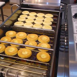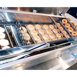Automatic fryer for standard size donuts, with an option for mini donuts. Capacity 30 dozen/hour, gas heated.