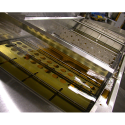 Automatic fryer for fast production of mini donuts. Capacity 102 dozen/hour, gas heated.